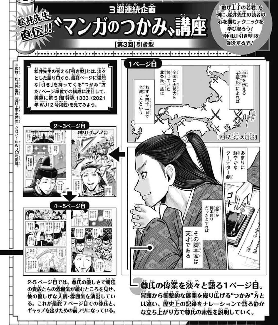 逃げ上手の若君 松井優征作品 公式 On Twitter Wj21 22合併号は本日4 26 月 発売 今週の 逃げ若 は時行 玄蕃による綸旨奪取編最高潮 表紙のピノキオ時行が手に入るプレゼントも スタートダッシュ漫画賞 も引き続き募集中 そして次号表紙 巻頭カラーを